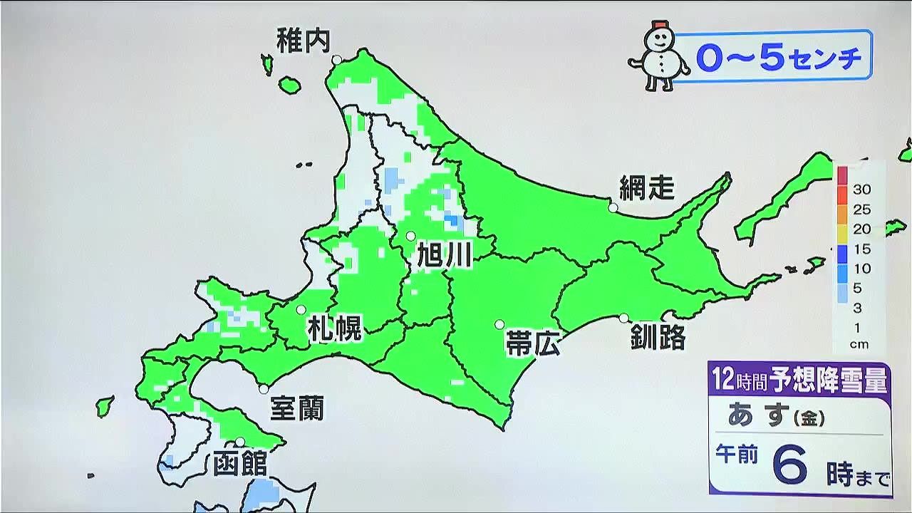 先週末から荒れた天気が続いていましたが、今夜は全道的に穏やかに経過します。あす16日(金)午前6時までの12時間降雪量は、道北や渡島半島など降っても5センチ以下で、あす朝は雪かきはお休みできそうです。