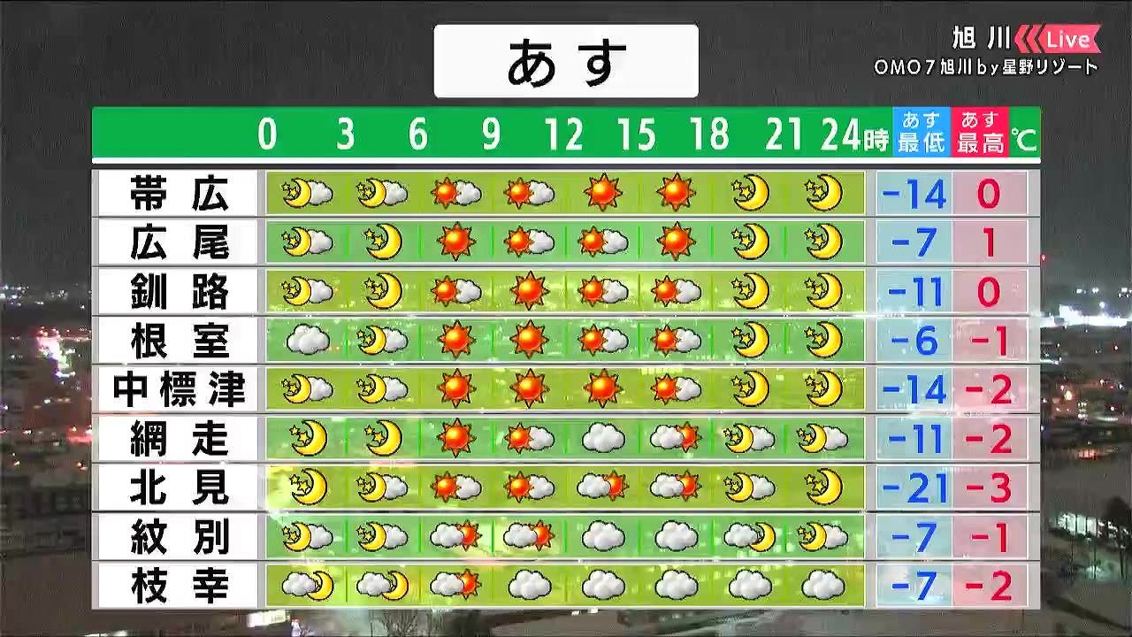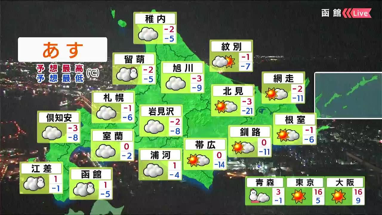 日本海側や道南の一部で雪が降りますが、雪の量は少ないでしょう。気温はきょう15日(木)と同じくらいです。晴れる東部は朝の冷え込みが強く、海岸部の釧路や網走でも-10度以下まで下がるでしょう。