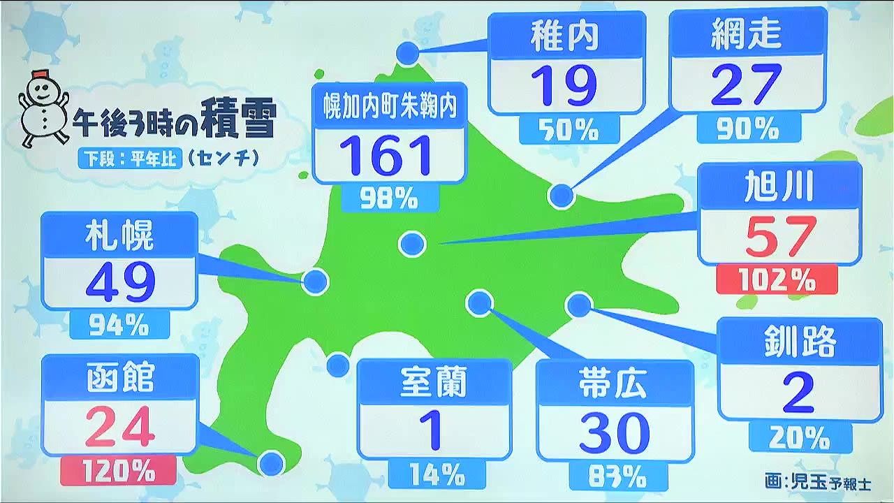 午後3時の積雪です。下の段は平年との差です。函館で平年より多くなっている他は、平年並みか少ないです。稚内は平年の半分の19センチ、札幌はほぼ平年並みの49センチ、道内で最も積雪が多い上川北部の幌加内町朱鞠内は161センチですが、これでほぼ平年並みです。 あす16日(金)降る雪の量は少ないですが、来週にかけて積雪が急増するおそれがあります。