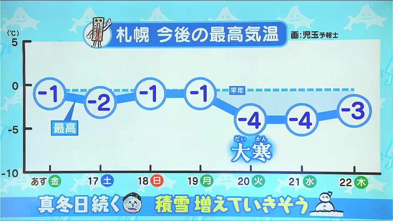 そして、20日火曜日は二十四節気の一つの「大寒」。一年で最も寒くなる頃ですが、暦通り寒気が強まり、-4度と寒さが厳しくなります。全道的にも同じような傾向で、強い寒気が居座る来週は、日本海側を中心に積雪が増えていきそうです。
