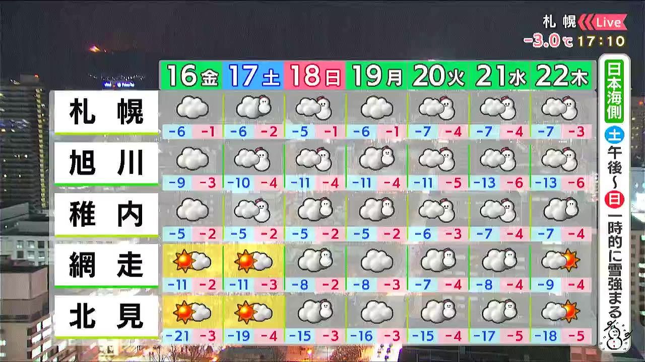 ※15日午後5時時点の情報です。最新の気象情報は、HBCウェザーセンターのホームページなどでご確認ください。HBCは気象庁の認可を2001年に得て以来、民間気象会社の一つとして「HBCの独自予報」を発信しています。