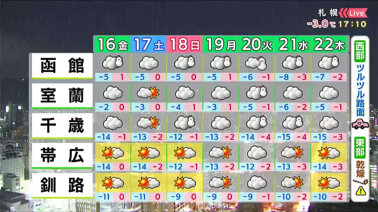 曇り空ですが、天気の大きな崩れはありません。風も弱く、割合穏やかです。ただ、気温はあす16日(金)も氷点下の真冬日です。横断歩道の白線やロードヒーティングの切れ目などツルツル路面に注意して下さい。