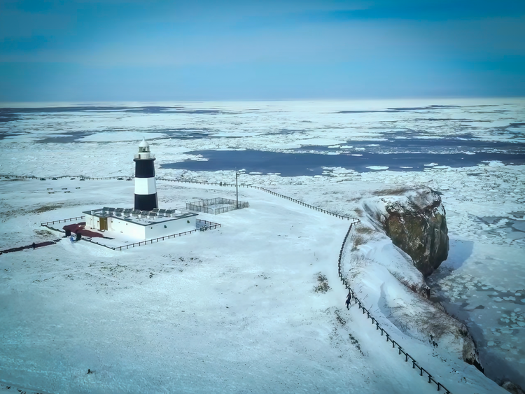 白と黒のストライプが印象的な「能取岬灯台」が、真っ白な世界をいっそうドラマチックに引き立てます。