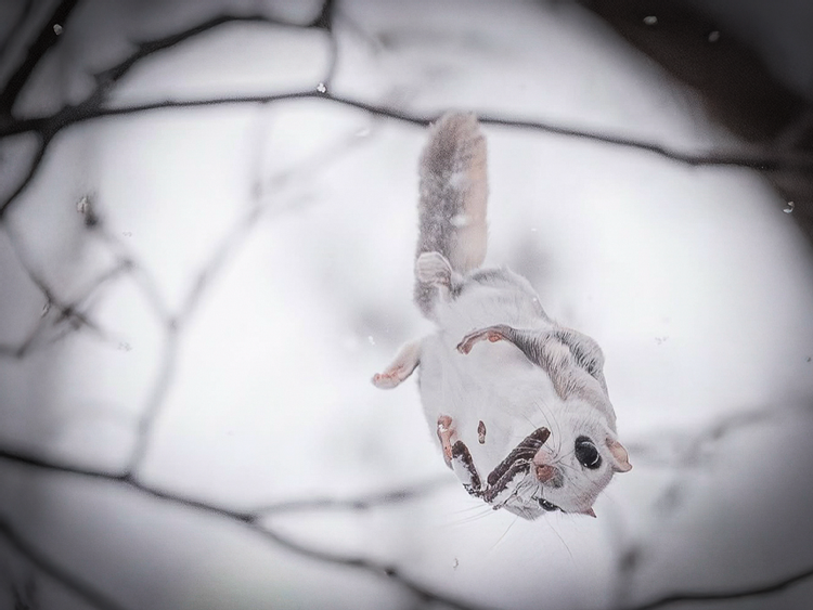 エゾモモンガのかわいらしさだけでなく、カラマツの枝にあたる光や、その奥に広がる「空気感」が何とも言えぬ美しい雰囲気を感じさせてくれるとってもステキなお写真ですねー。