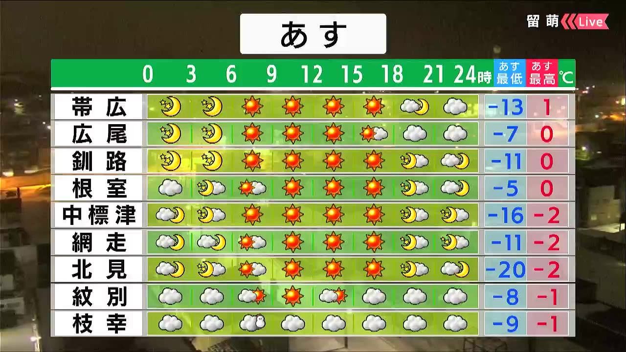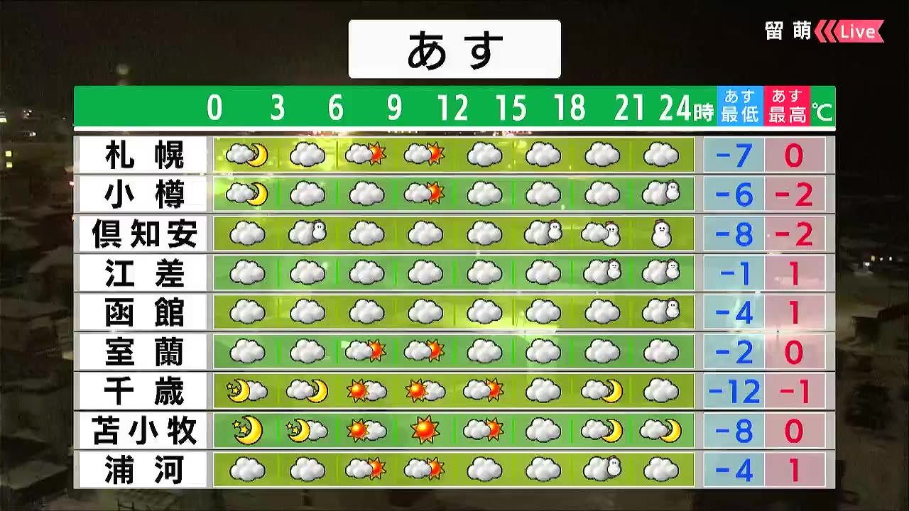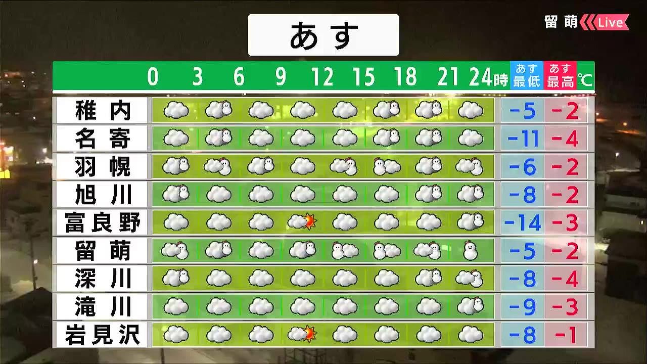 あす朝にかけては割合穏やかな天気です。あす午前6時までの12時間降雪量は、留萌や岩見沢周辺で青色、降っても5センチ前後でしょう。交通への大きな影響はなさそうですが、受験生は寒さとツルツル路面に気を付けて下さい。