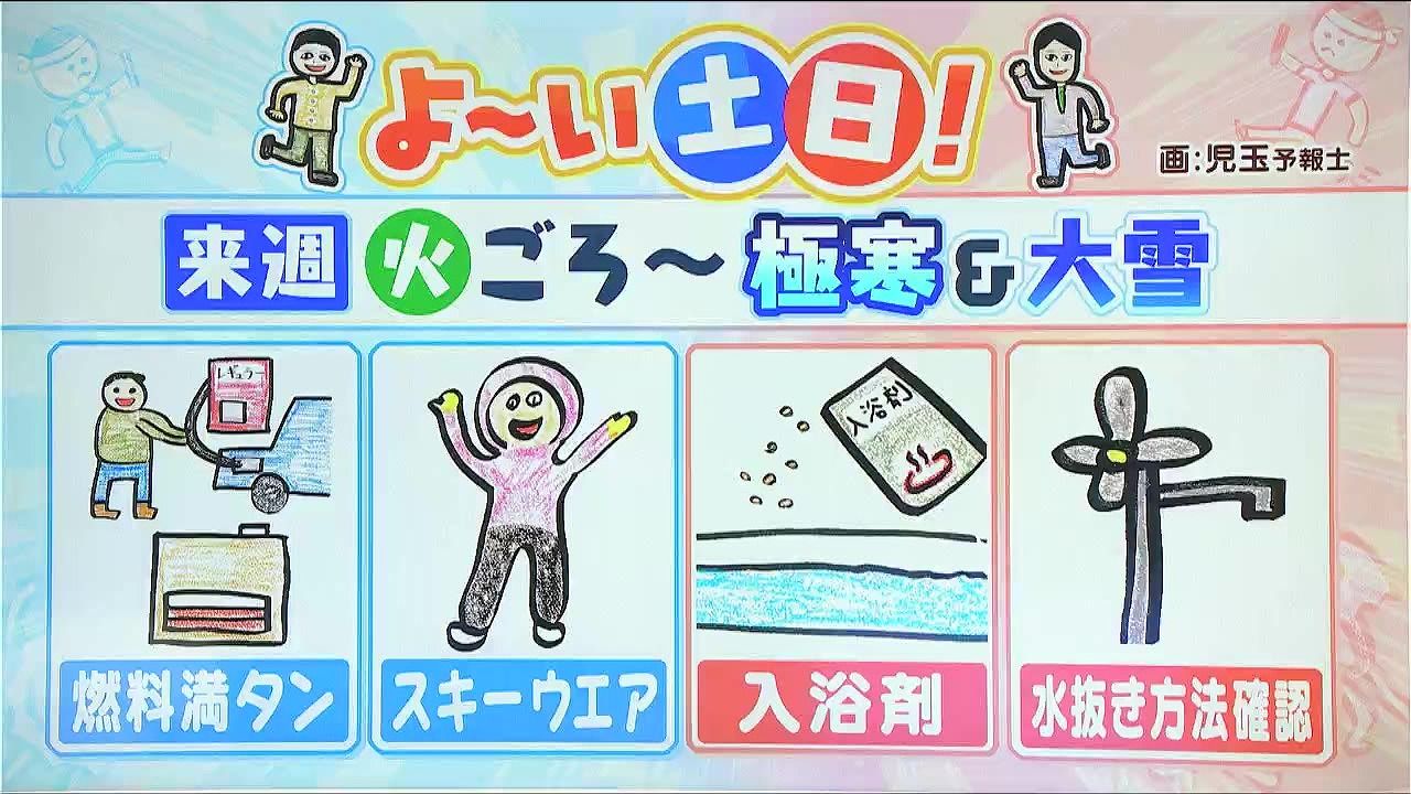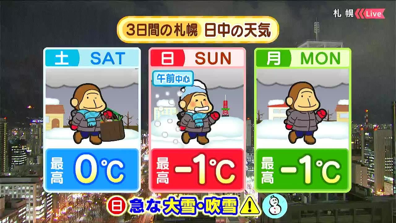 日曜は午前を中心に留萌や石狩、空知、後志地方で警報級の大雪となるおそれがあります。来週の火曜、水曜も雪の降り方が強まるでしょう。火曜日以降、最高気温は‐5度前後です。