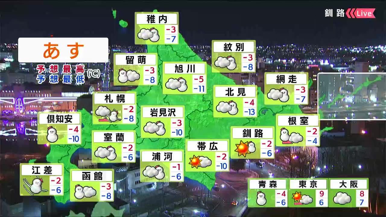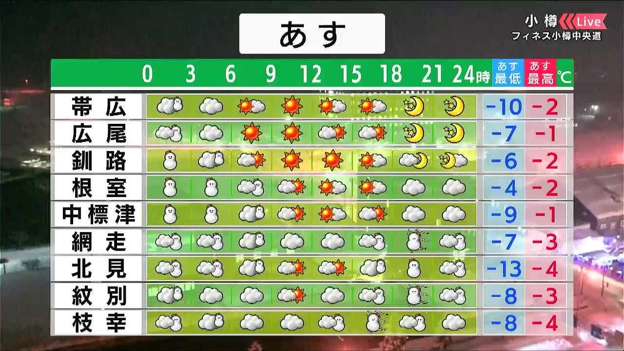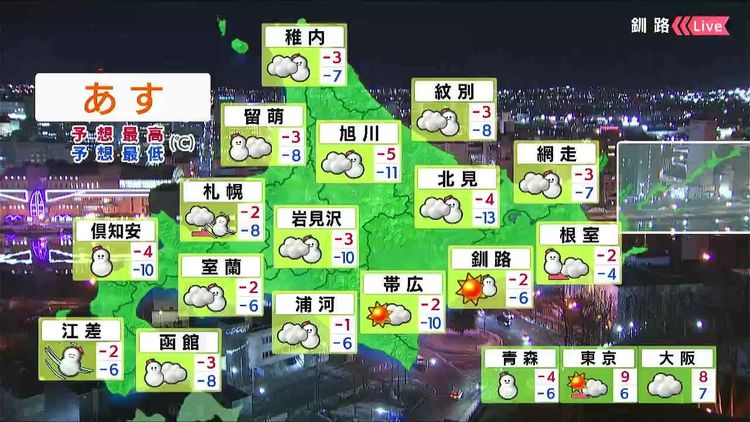 日本海側やオホーツク海側を中心に雪が降り、雪や風の強まる時間があるでしょう。最高気温は各地でマイナスの真冬日です。