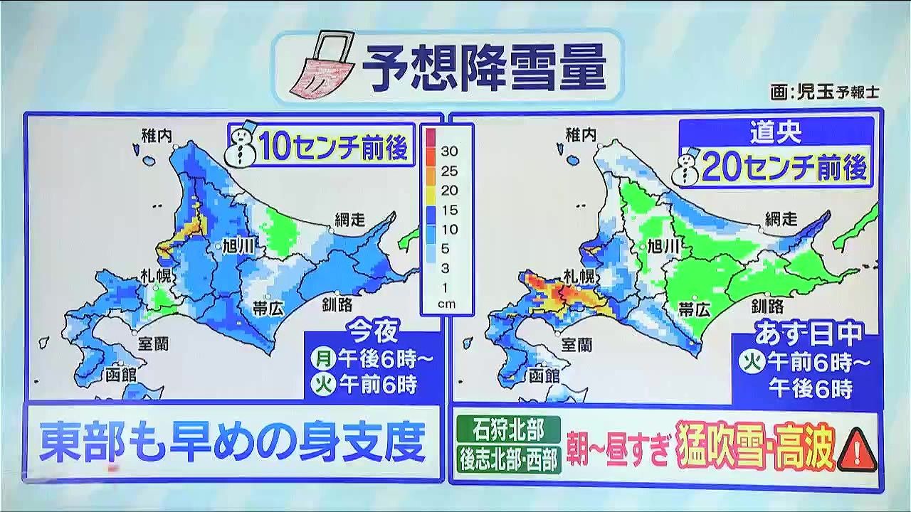 そして、あす日中は札幌周辺など道央が雪の中心で、多いところ20センチ前後です。風も強まり、石狩北部や後志北部、西部では、あす朝から昼過ぎにかけて猛吹雪や高波に警戒して下さい。札幌ではあす午後から積雪が急増しそうです。