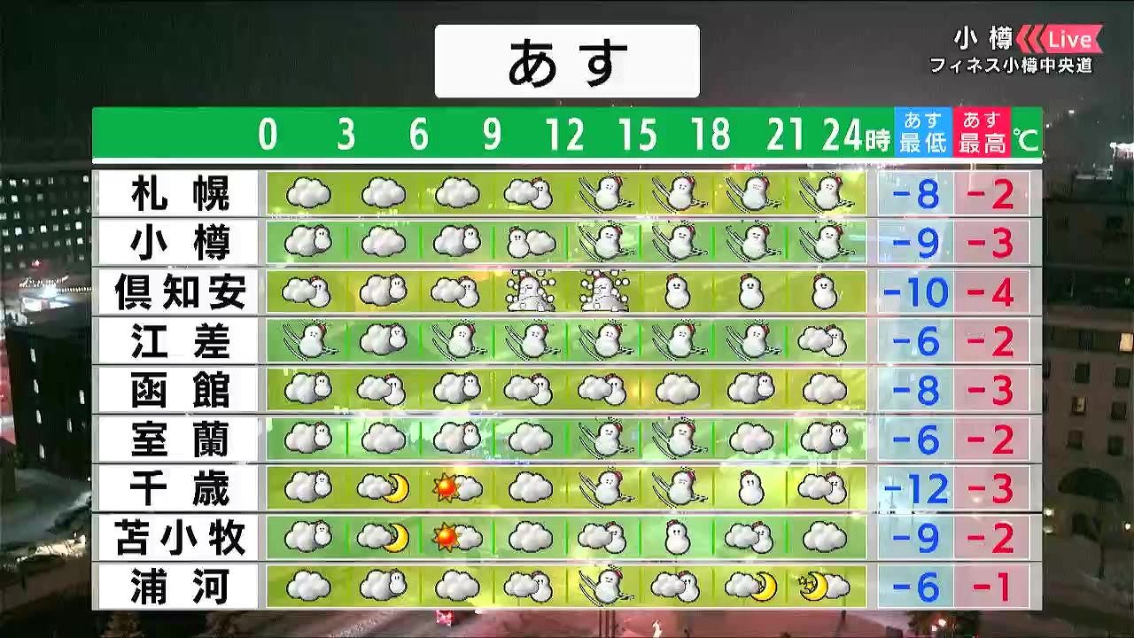 午前を中心に広く雪が降るでしょう。留萌や空知、石狩北部では昼前と夜に雪や風が強まり、急に見通しの悪くなることがありそうです。最高気温は‐5度前後です。