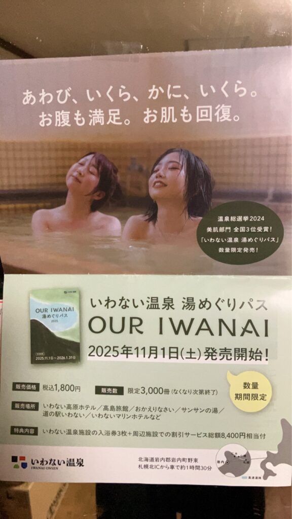 いわない温泉郷の6軒、いわない高原ホテル、髙島旅館、おかえりなさい、サンサンの湯、道の駅いわない、いわないマリンホテルなどで使える入浴券3枚、周辺施設で使える割引サービス総額8,400円相当が付いた温泉パス。