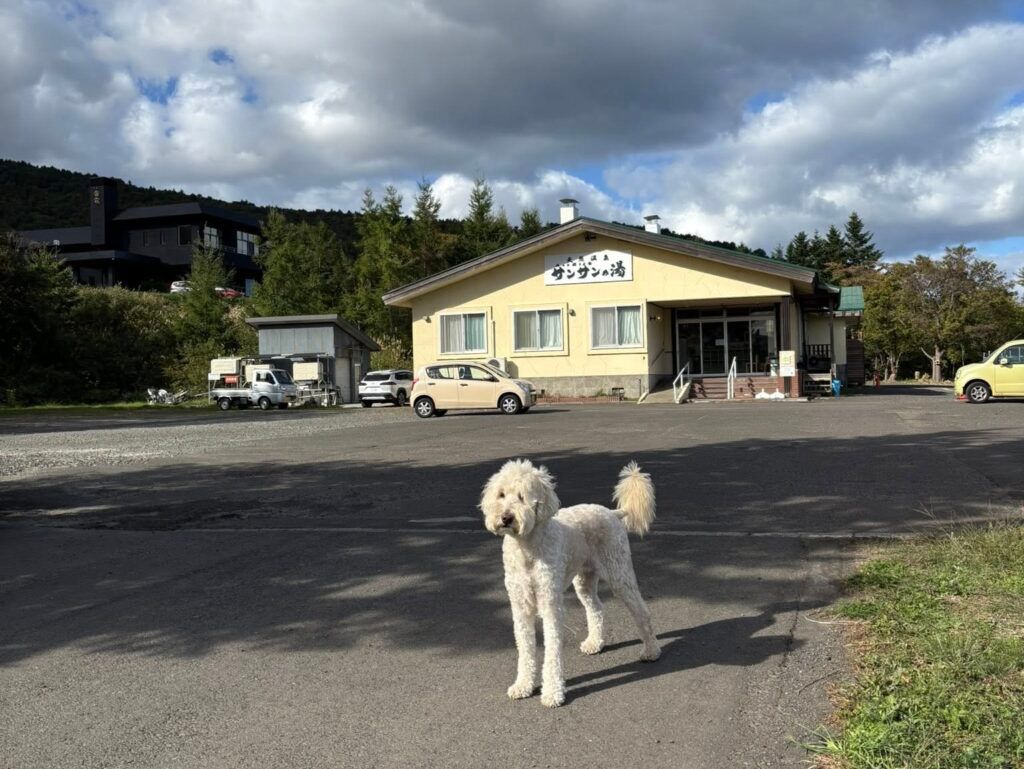 看板犬のハニーちゃんがお出迎えしてくれる「サンサンの湯」は、元々昭和53年に岩内町の「憩いの湯」(湯治場)として開かれた歴史をもち、いろいろあって平成11年より山好き、ワンちゃん好きの今の伊藤夫妻が受け継いだ。