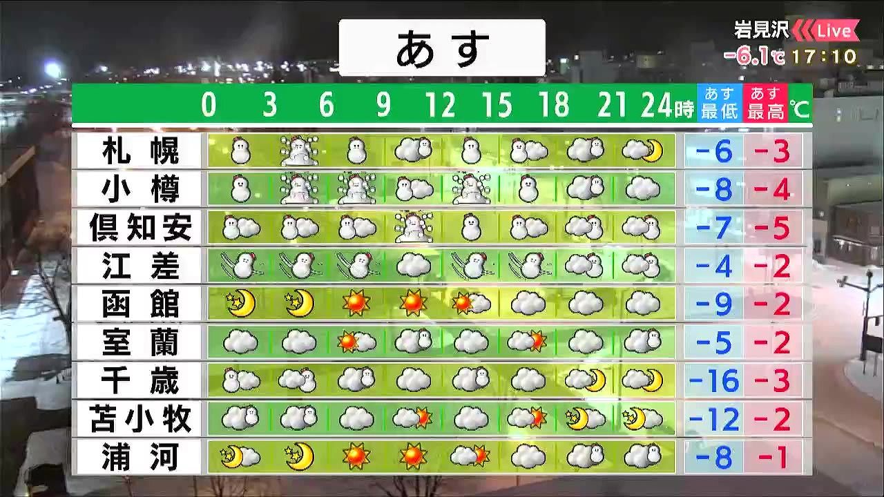 札幌や小樽、倶知安は強い雪で見通しが悪く、あす夕方までに30センチ以上の大雪になるおそれがあります。交通障害に注意して下さい。道南江差はふぶくでしょう。