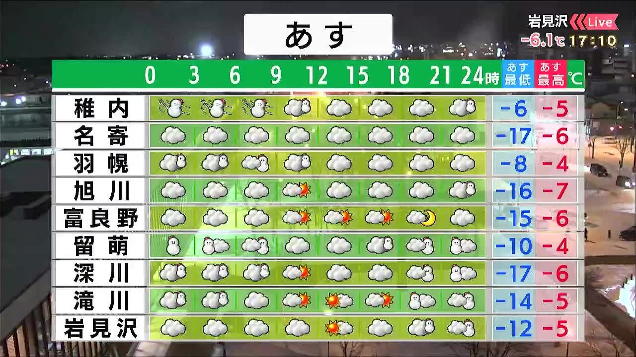 朝は海岸部で雪が降り、留萌周辺で雪が強まります。旭川など内陸は穏やかですが、冷え込みが強まるでしょう。夜は空知地方で雪が強まりそうです。