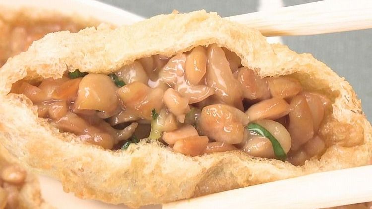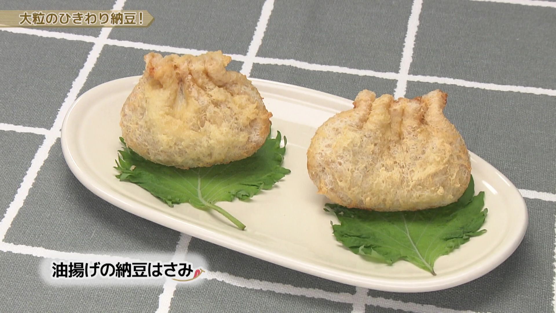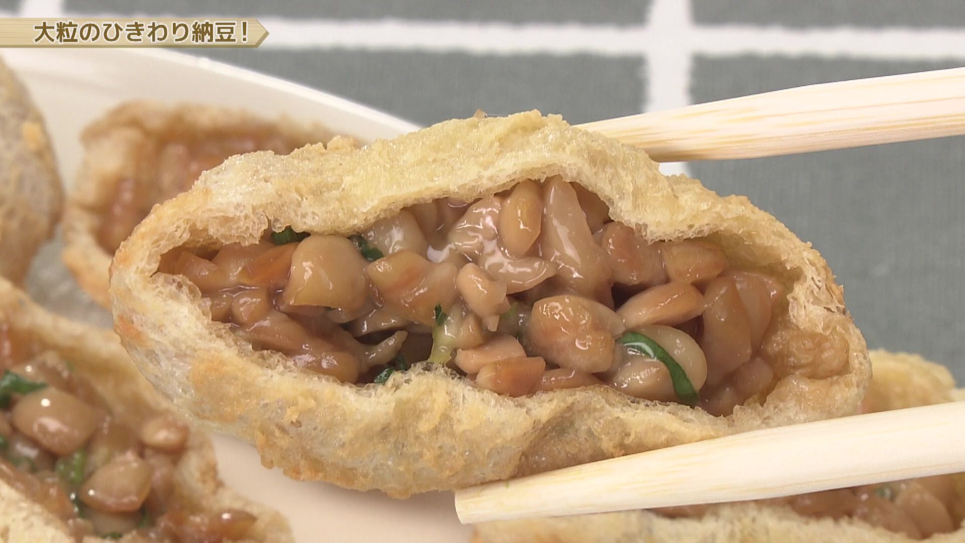 小林大作社長に教わった一品は油揚げを裏返して、中に納豆を入れた【油揚げの納豆はさみ】。裏返すことで食感がカリッとして、さらに美味しくなりますよ~!