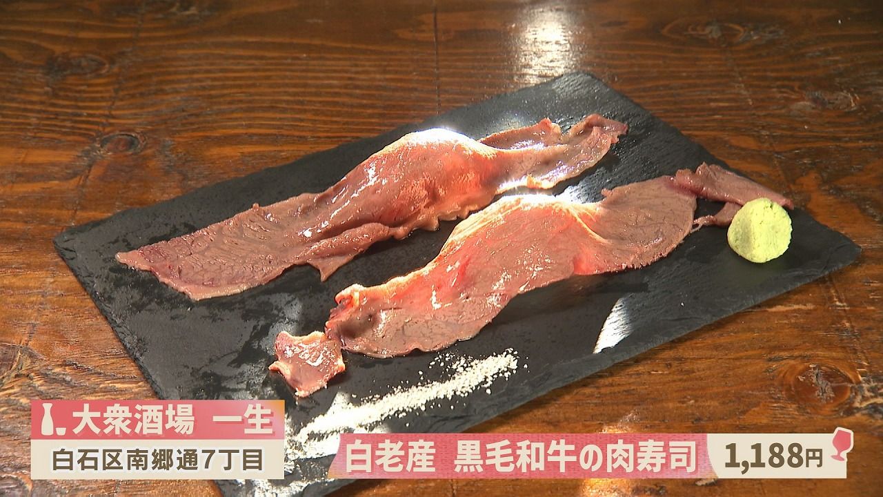 白老産黒毛和牛の炙り寿司は、ひと口で分かる、上質な肉のうまみ。