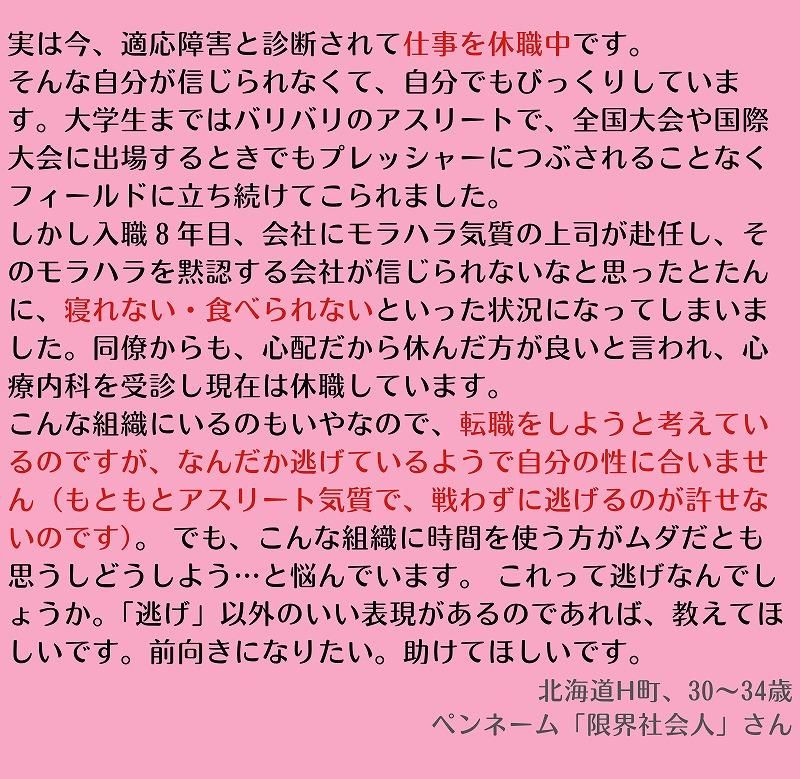 この名前で呼ぶのも心苦しいけれど……「限界社会人」さん、お手紙送ってくださり感謝です。