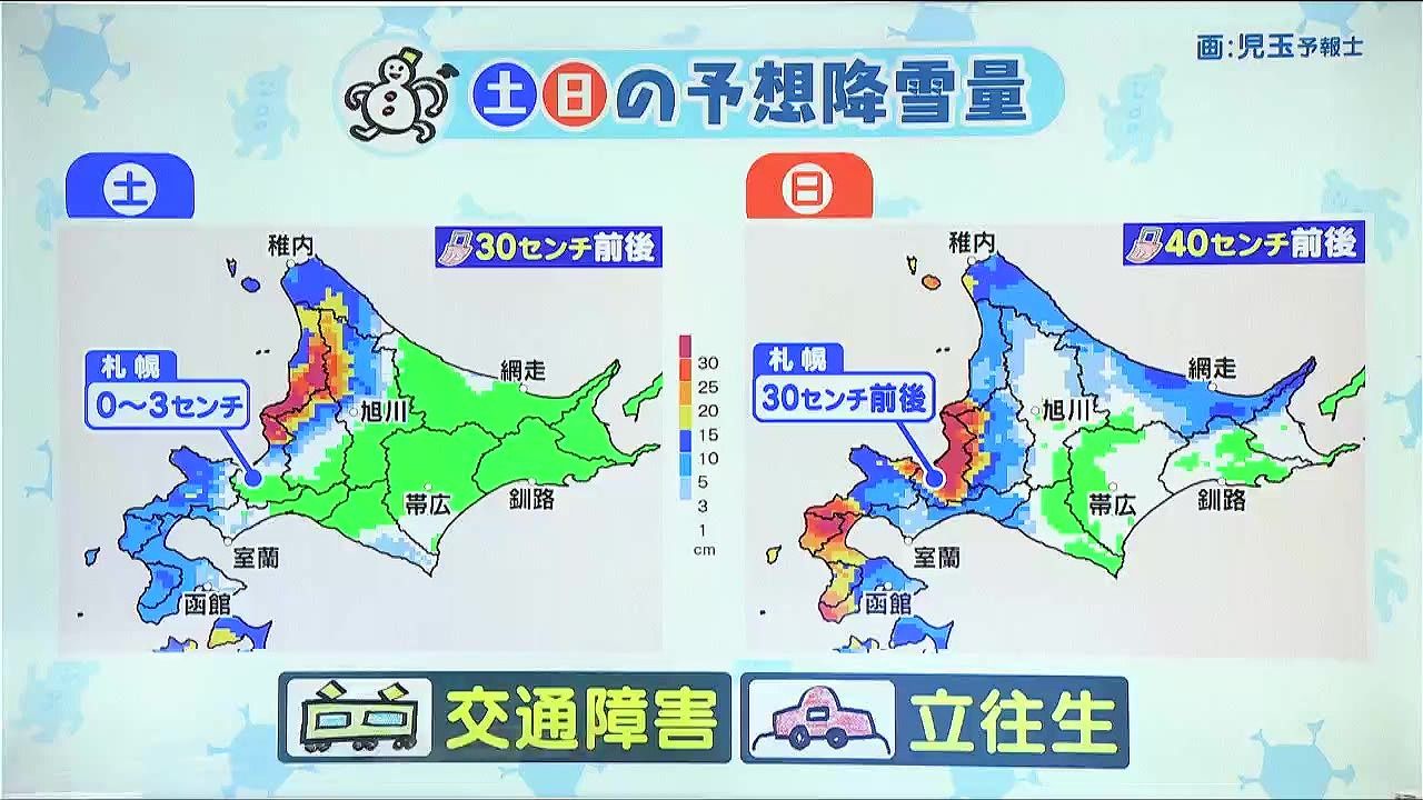 土日の予想降雪量、紫色は30センチ以上のエリアです。あす24日(土)は留萌や上川北部の幌加内町など道北の多いところで30センチ前後、日曜は札幌周辺、長万部周辺で30センチ前後、局地的に40センチくらいの大雪になりそうです。