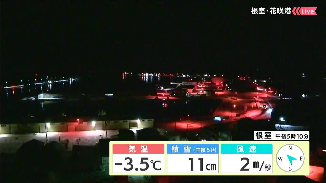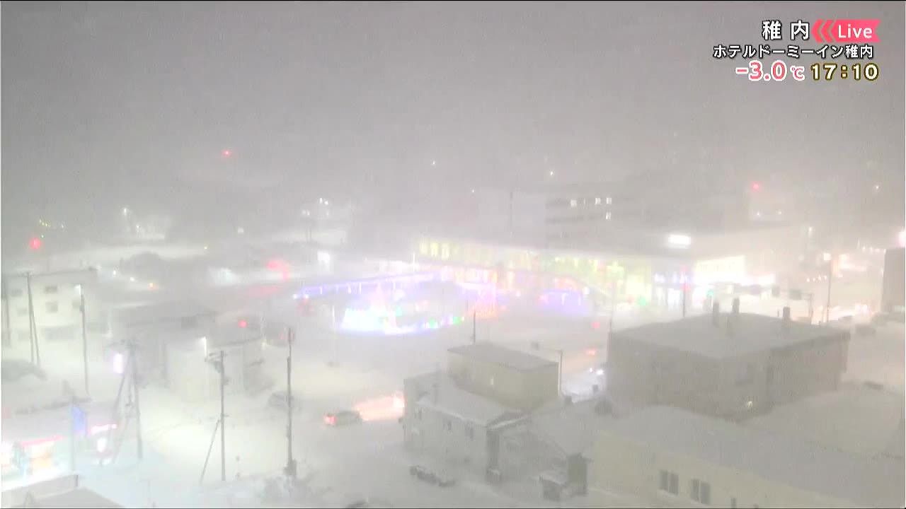 稚内は雪が画面の右から左に流れるように降っています。