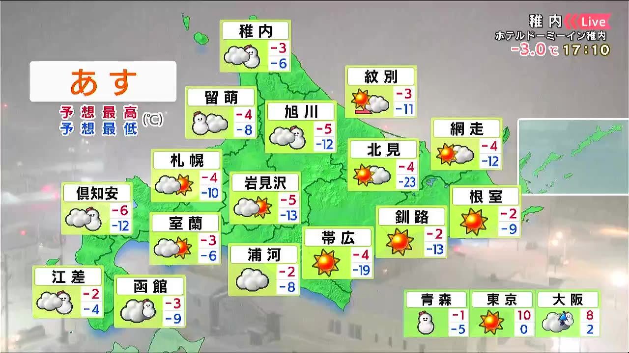 札幌は昼頃に雪がちらつく程度で日が差します。倶知安や江差はあす24日一日で5~10センチの雪が降るでしょう。千歳は晴れて、朝は‐17度まで冷え込みます。