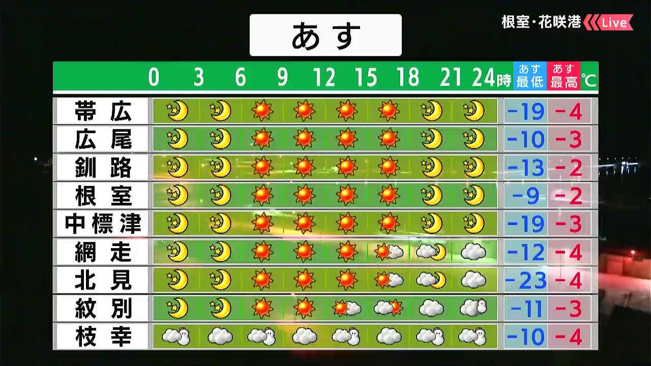 広く晴れて、空気の乾燥が続きます。道北の枝幸では5センチ前後の雪が降るでしょう。朝は帯広で‐19度、北見は‐23度と冷え込みます。