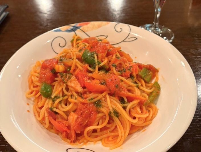 トマトの酸味と甘味が絶妙で、ピーマンの香りとベーコンのコクが加わり、シンプルながら奥深い味わい。ワインとの相性も抜群で、ゆっくりと味わいたくなる一皿です。【ディナー時ワンドリンク制】