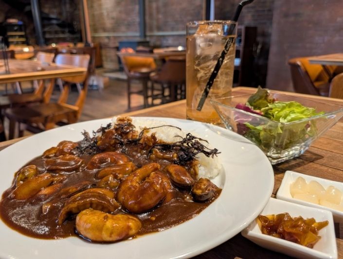 ランチタイムには、港町ならではの「港町シーフードカレー」が人気。エビ、ホタテ、ムール貝が贅沢に入り、海苔が磯の香りを引き立てる、辛さ控えめで誰もが楽しめる逸品です。