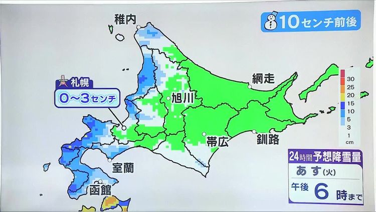 大雪にはならない見通しです。あす午後6時までの24時間で濃い青色、留萌や後志、渡島半島の多いところで10センチ前後でしょう。記録的な大雪となった札幌も雪の量は少ないいですが、大雪の影響は残るので、あすも時間にゆとりを持って出かけましょう。