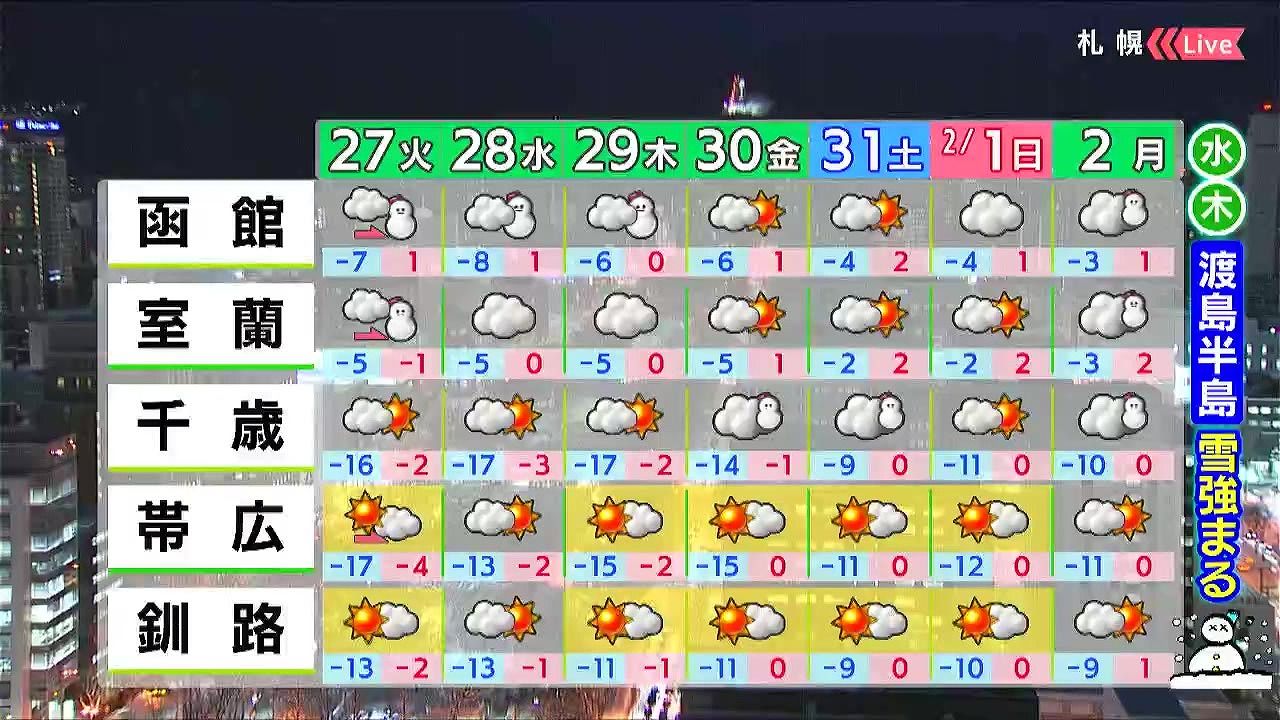 水曜から木曜にかけて渡島半島で局地的な大雪になるおそれがあります。東部は晴れて、空気の乾燥が続くでしょう。最高気温は函館や室蘭でプラスの日が多くなりそうです。