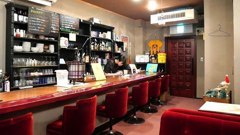 カウンター6席と4人掛けボックス席が2つ。そして椅子が赤い別珍!!(って、いくつくらいまで通じるのかな…笑)