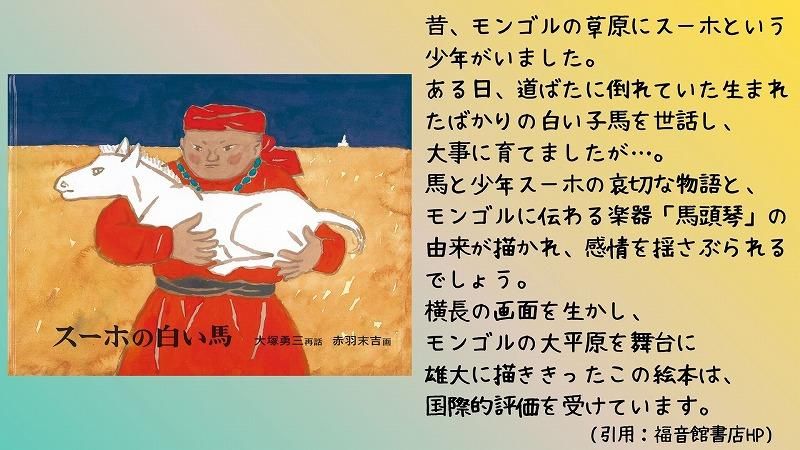 『スーホの白い馬』は現在も小学2年生の国語の教科書の中で、教材として掲載されています。