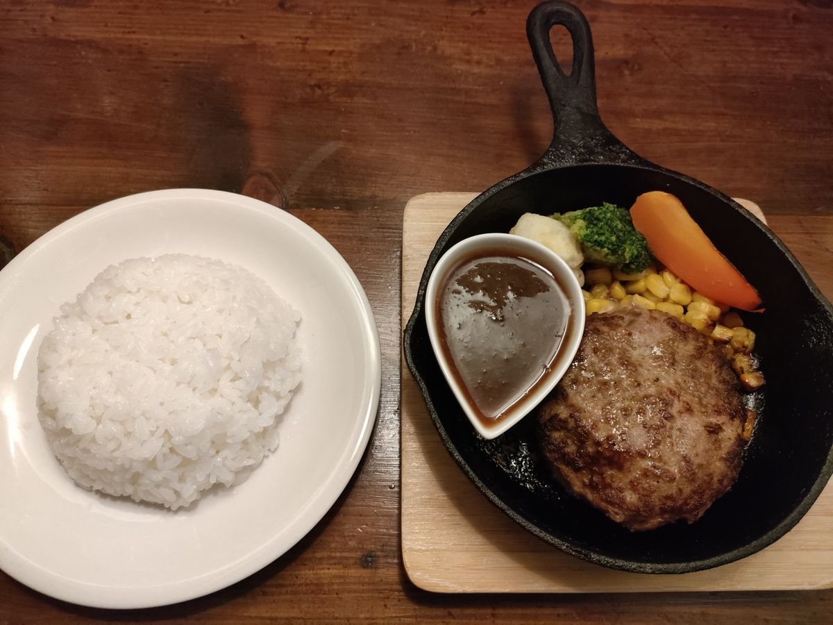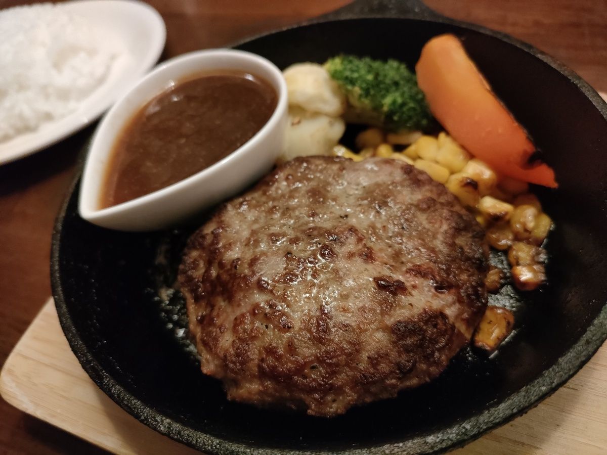 アツアツのスキレットにジュウジュウと焼かれたハンバーグは、少し焦げがあり程よい香ばしさを感じられます。