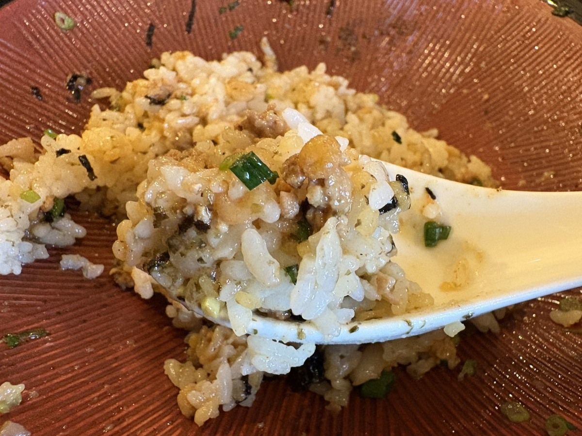 麺を食べきったあとは、残った具材に追い飯を追加!