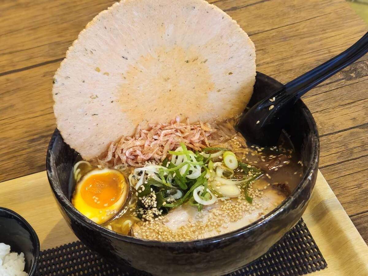 大きなえびせんがスープに刺さって登場するインパクト大なメニュー!