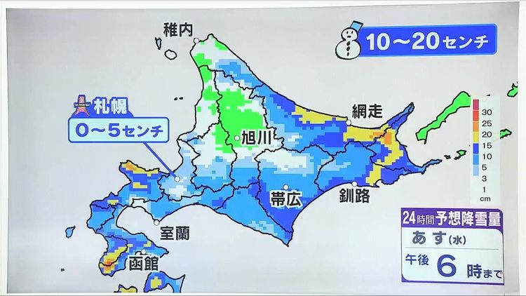 このあと、積雪は増えていくのか、あす28日(水)午後6時までの24時間降雪量です。道南や道東方面を中心に濃い青や黄色の10~20センチです。道東方面でもあす28日(水)朝は広く積雪路面となりそうです。札幌は雪の量は少ないですが、大雪の影響が残る可能性があるので、あす28日(水)朝も時間にゆとりを持ちましょう。