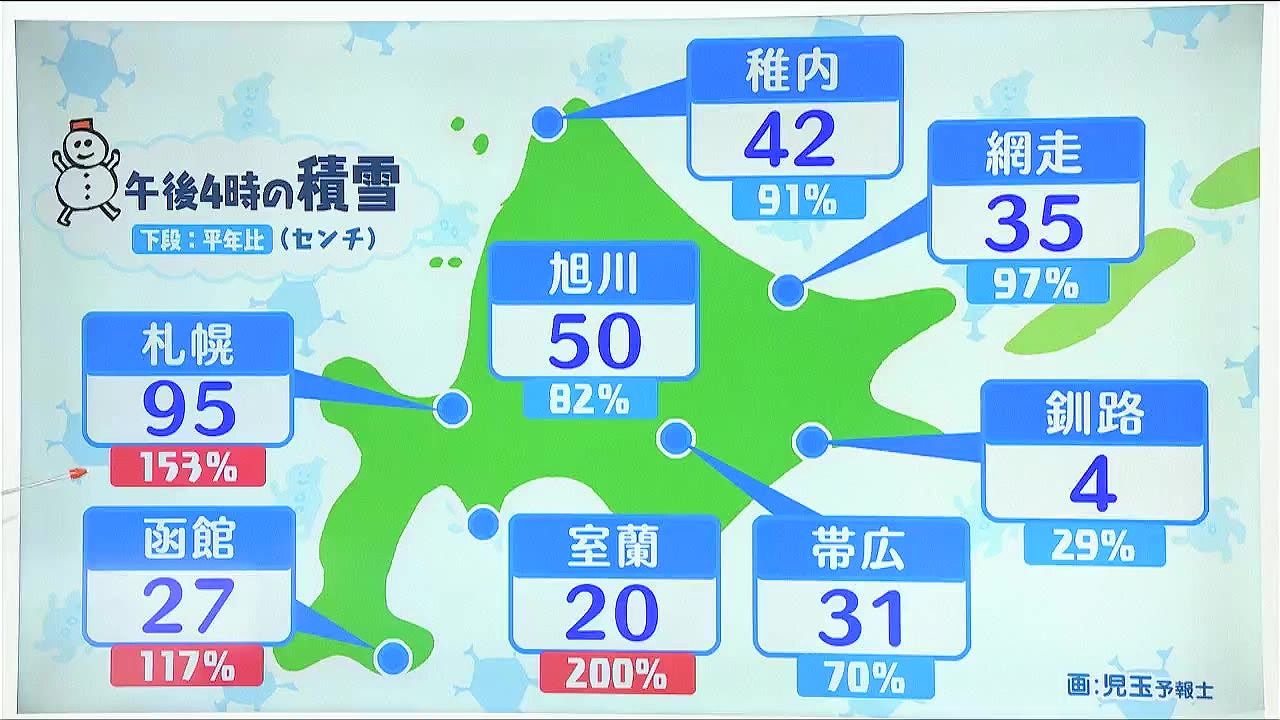 下の段は平年との差です。札幌は95センチで、平年のおよそ1.5倍です。室蘭は平年の2倍の20センチ、函館も平年より多くなっています。一方、道北や道東方面は平年並みか少なく、旭川は50センチで平年の8割ほどです。