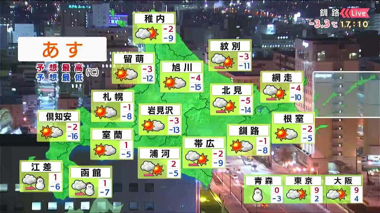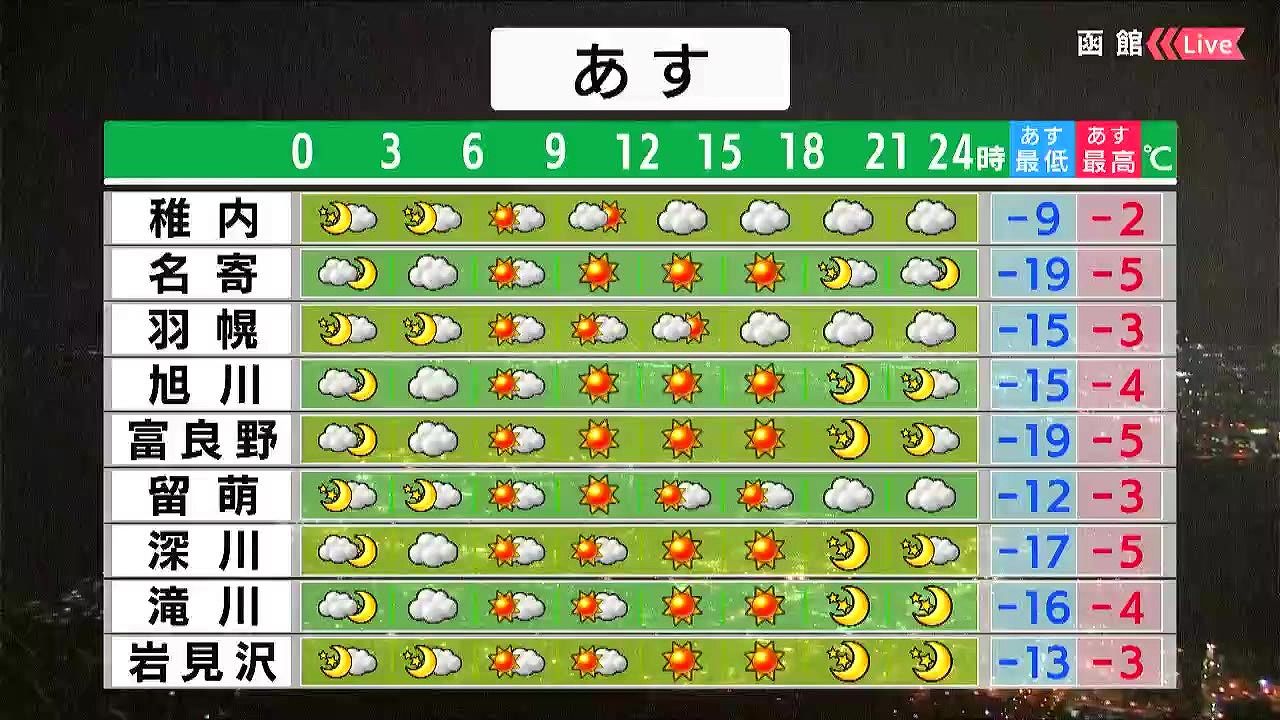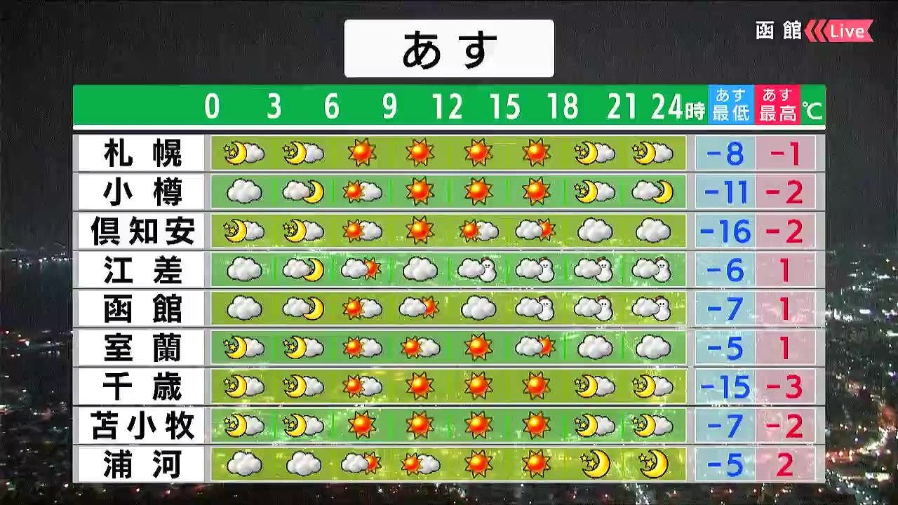 札幌や小樽、千歳など広く晴れる見込みです。道南は雲が広がり、江差は昼過ぎから、函館は夕方から湿った雪が降るでしょう。