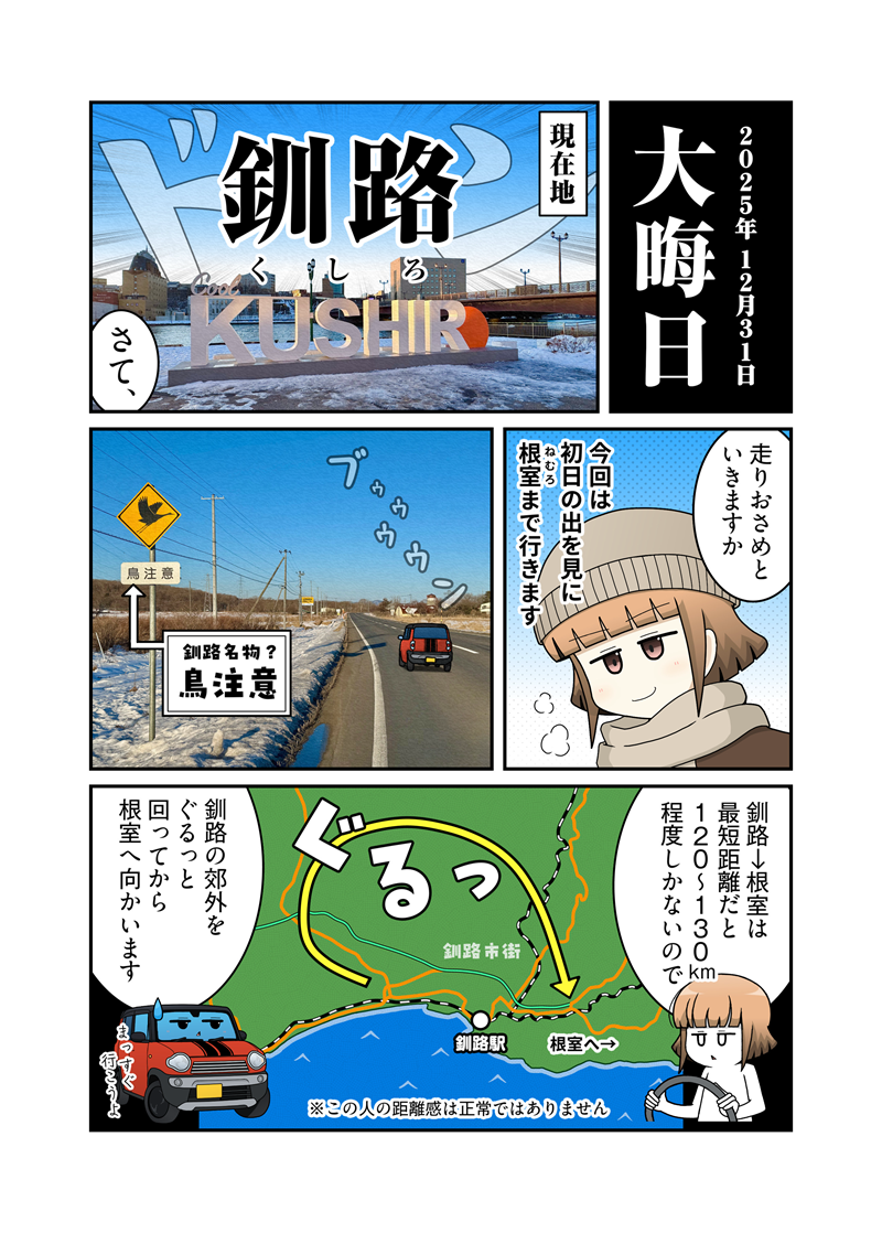 第9話になる今回は、年越し回!本土最東端の地「納沙布岬」に初日の出を見に行きますが、普通に行くと120~130キロで物足りない(?)白丸さんは、変わったルートで進むようです。