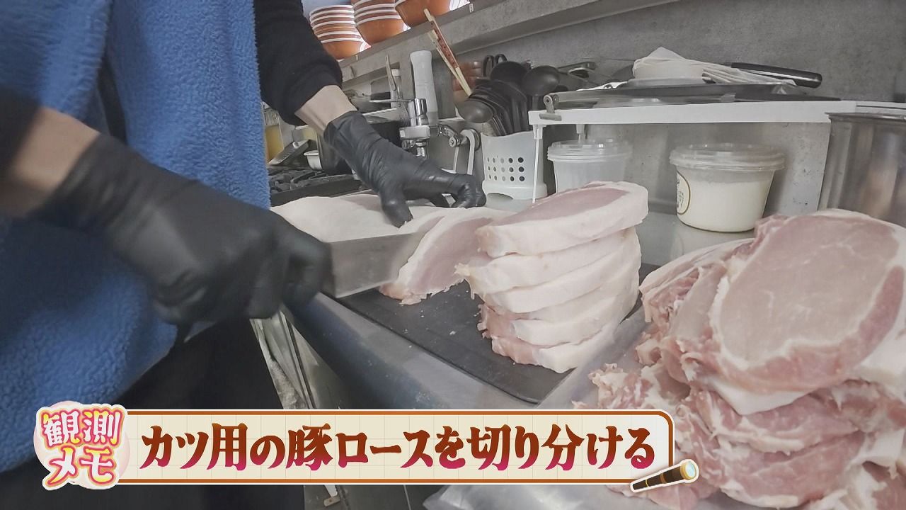 カツ用の豚ロースを手際よく切り分けていきます。