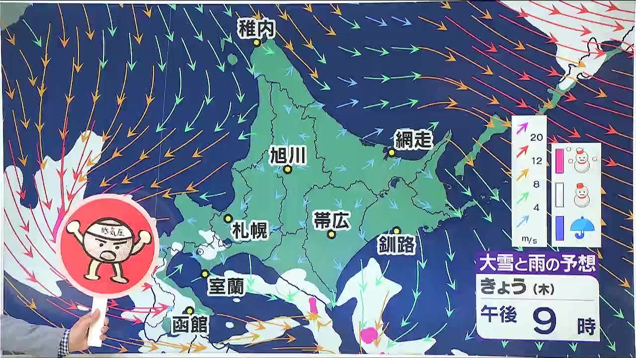 この冬は低気圧の影響を受けやすく、局地的な大雪になることが多くなっています。今夜9時の雪と風の予想は、道南方面で雪の降りやすい状態が続きます。矢印は風で渡島半島で矢印が渦状になっています。