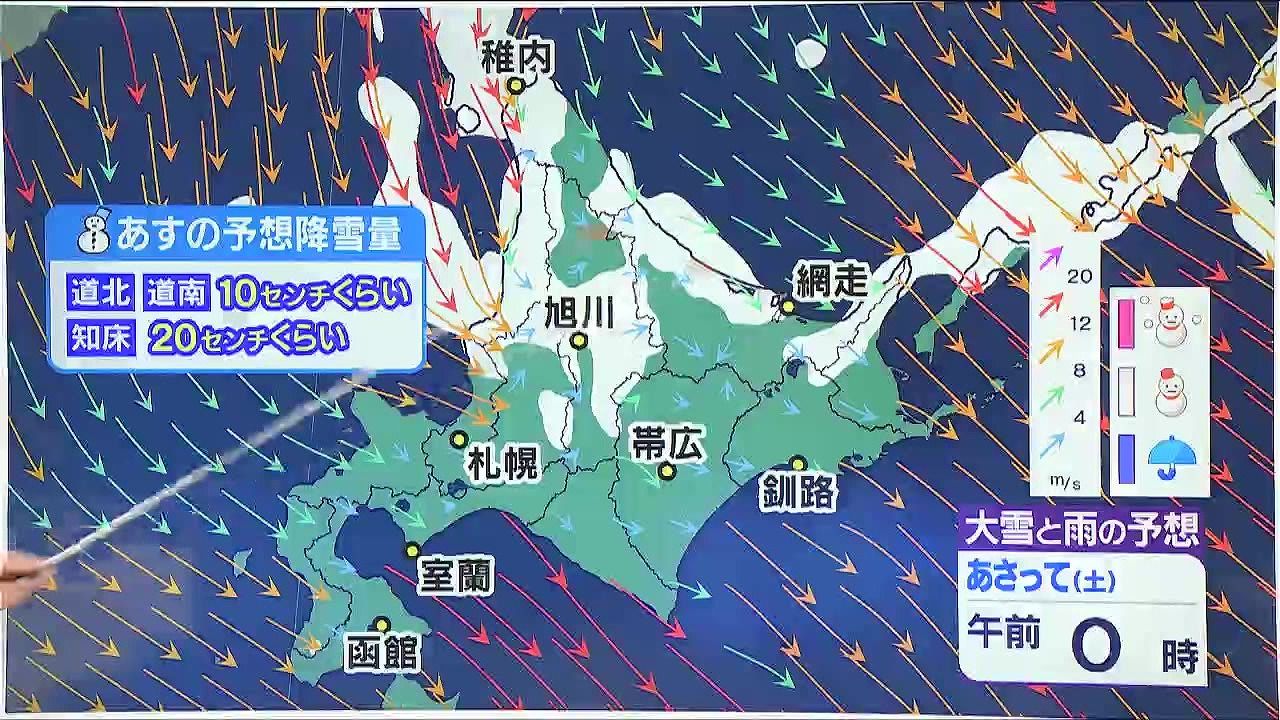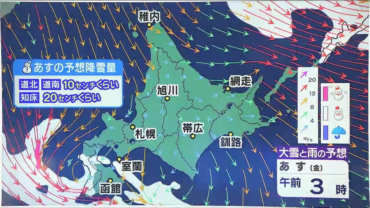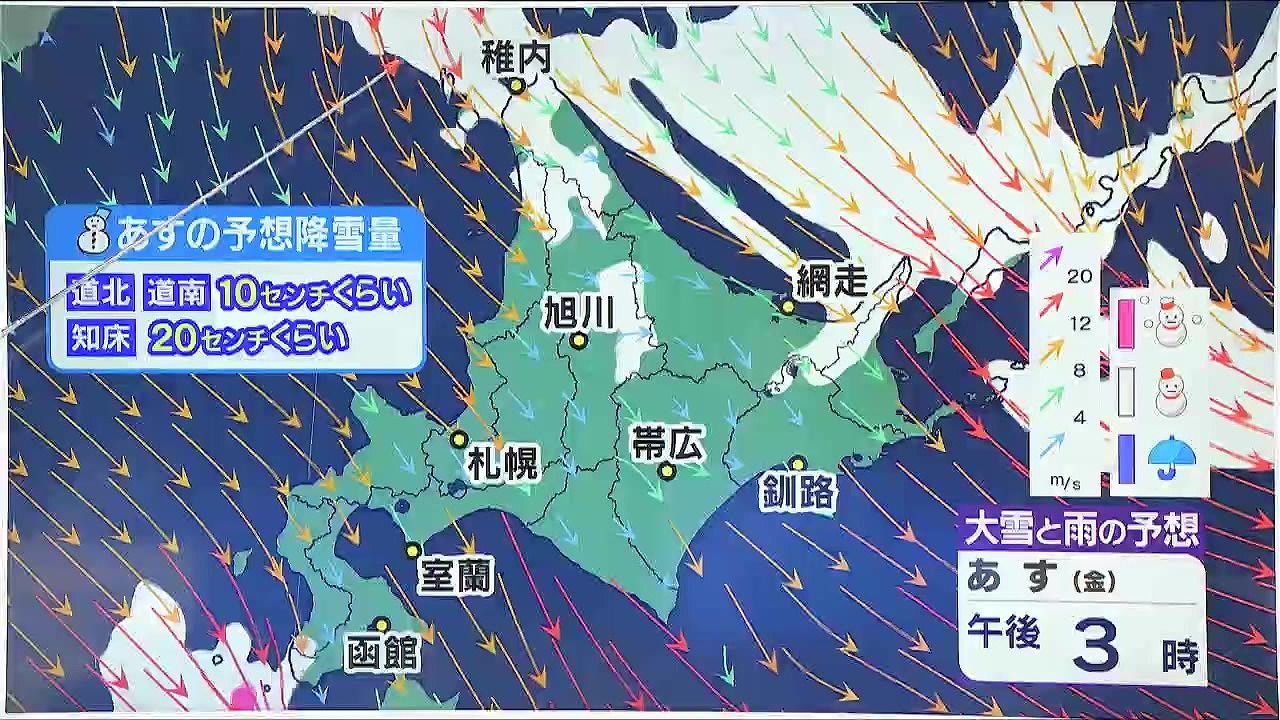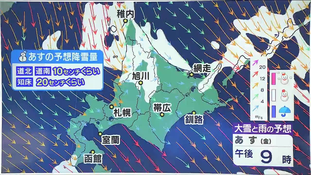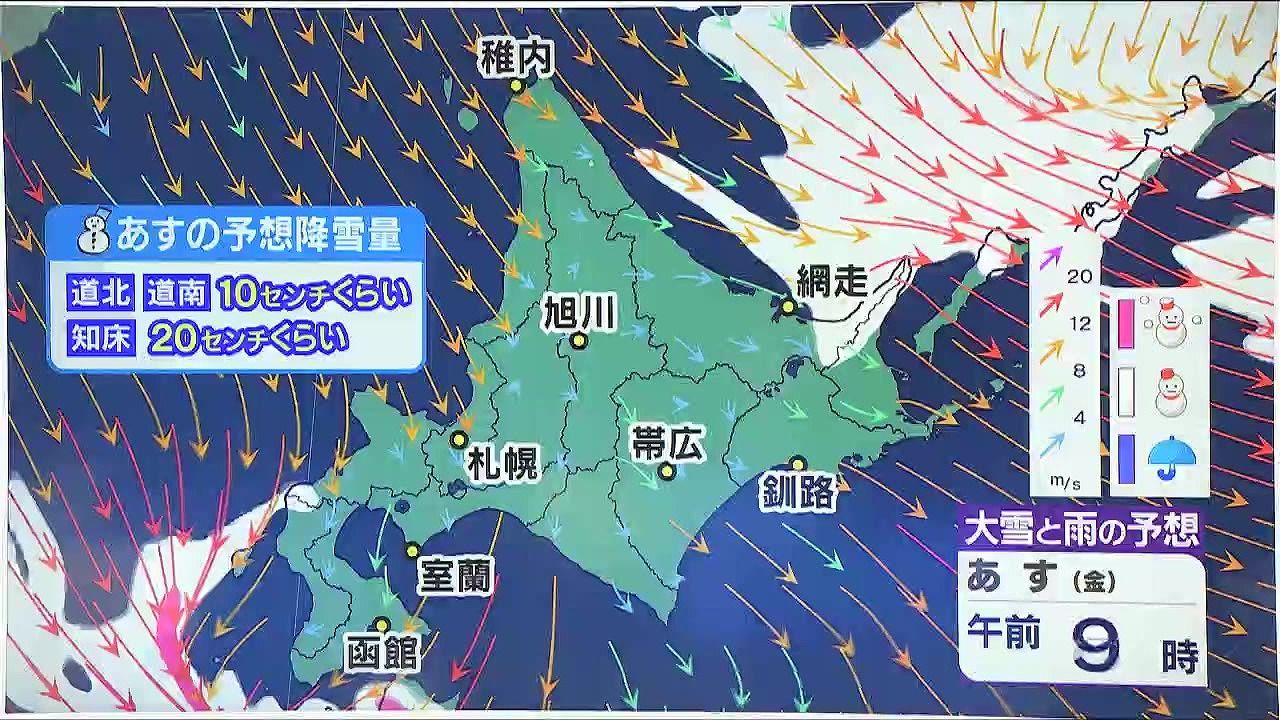 あす30日(金)降る雪の量は、道北や道南で10センチ、知床半島で20センチくらいです。