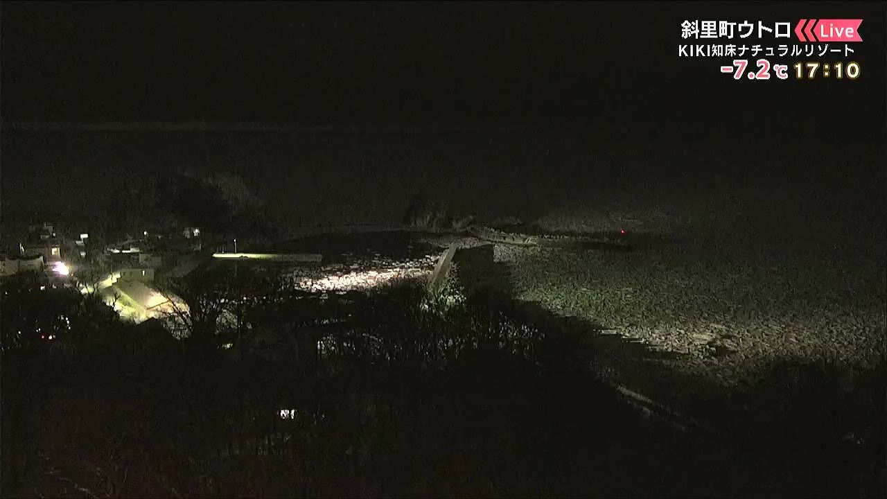 斜里町ウトロです。港がライトアップされていますが、流氷が流れ込んでいます。