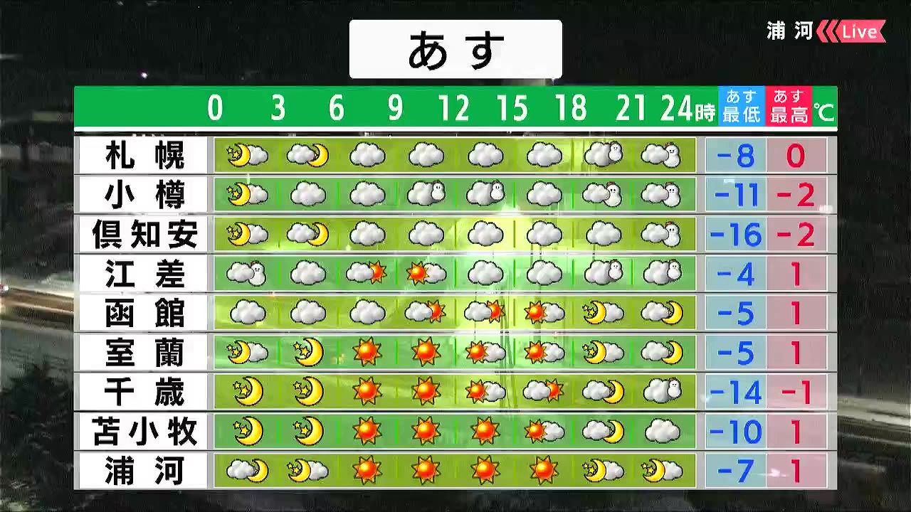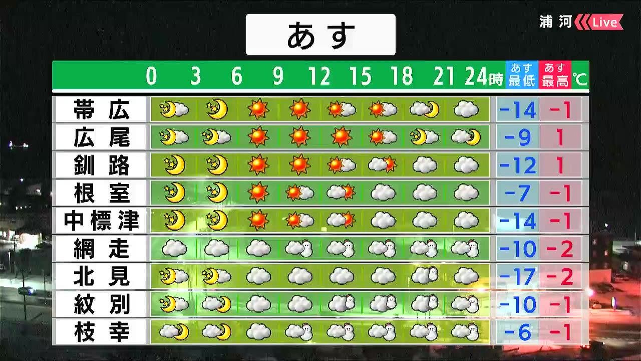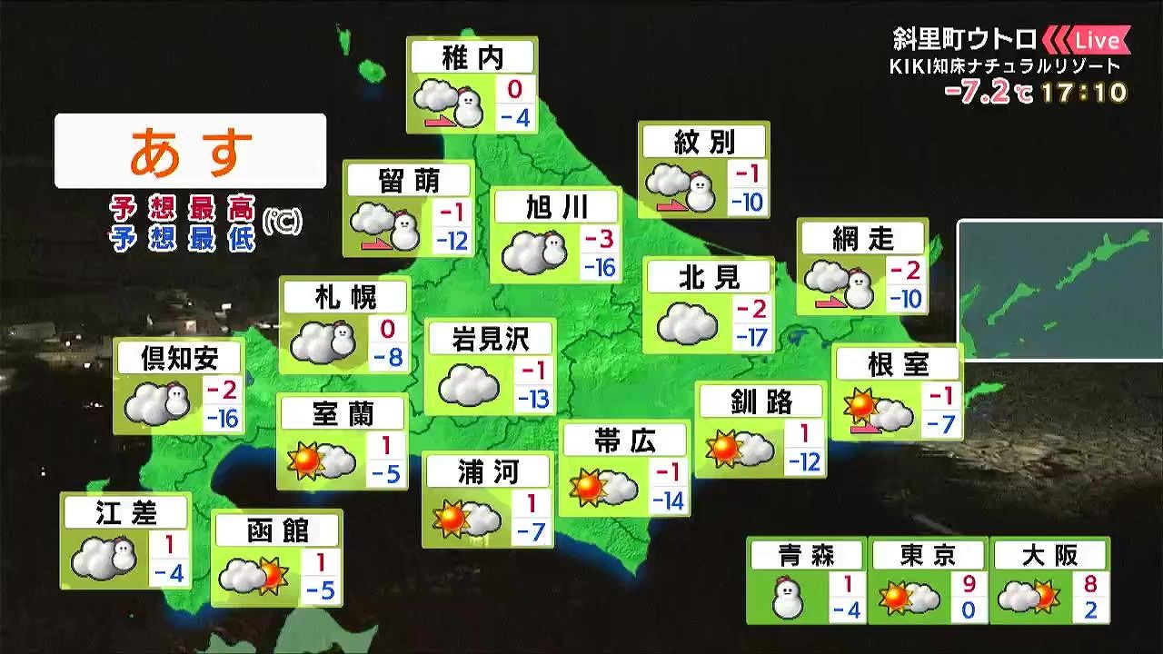 道東は晴れる見込みです。オホーツク海側の海岸部は昼頃から雪が降り、ふぶく時間があるでしょう。知床半島で20センチ近い雪が降りそうです。