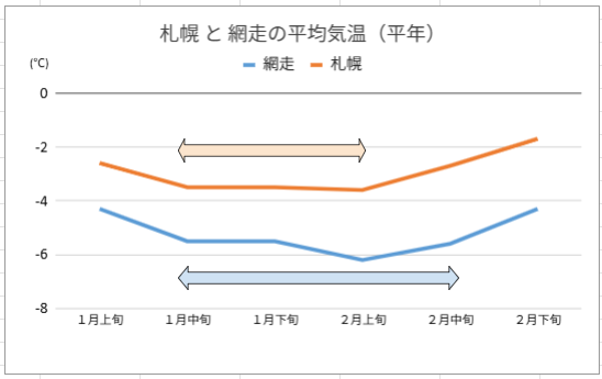 網走では2月上旬には最低気温の平年がー10度を下回り、日中も氷点下の気温が当たり前のように続きます。