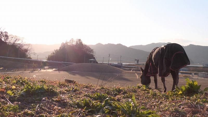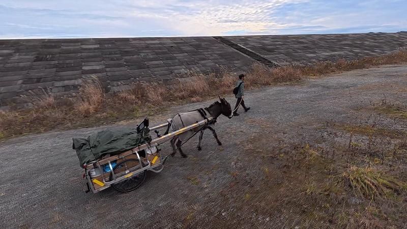 ロバのクサツネと歩く海岸沿いの道。すぐ横には高い防潮堤が続き、海と陸を隔てています。