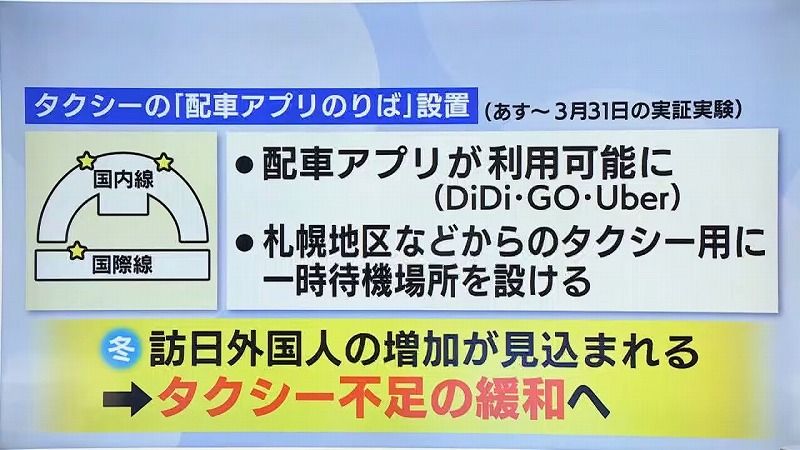 また、札幌地区などのタクシ-は予約がないと新千歳空港で客を乗せることができませんでしたが、新たに一時待機場所が設けられ、札幌地区などのタクシーもアプリで注文依頼があれば客を乗せることができます。