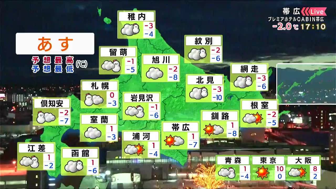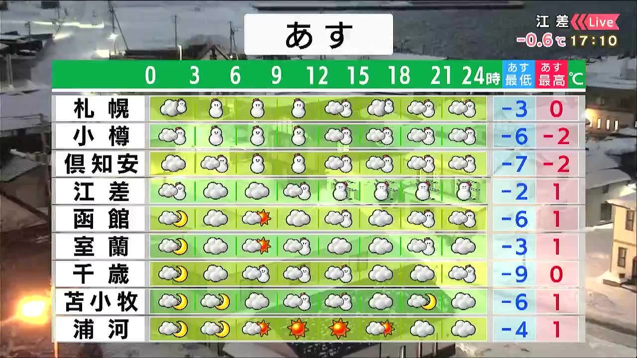 海岸部を中心に雪で、留萌周辺で10センチくらいの雪が降るでしょう。空知地方でも朝晩を中心に5センチ前後の雪が降りそうです。旭川は曇り空で割合穏やかです。