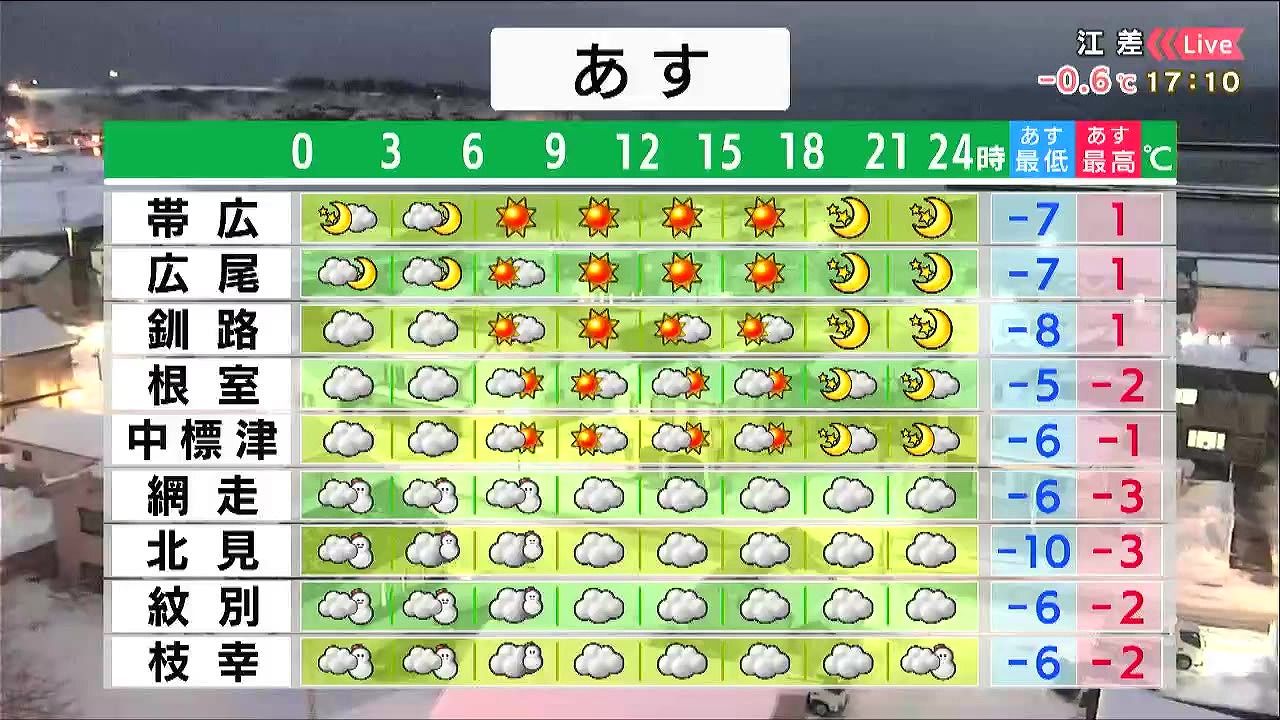 道東晴れて、強い風はおさまるでしょう。オホーツク海側は朝まで雪が降ります。知床周辺では昼頃まで雪で、10センチ前後の雪が降るでしょう。