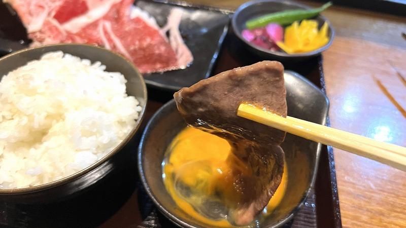 そして、ごはん(道産米のななつぼし)、岩のりの味噌汁、漬物、そこに焼きすきはこだわり卵が、焼きしゃぶは3種のタレがついて、定食として味わうことができます!