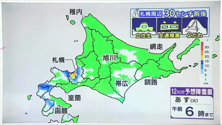 あす3日(火)午前6時までの12時間に、札幌周辺が雪の中心です。黄色やオレンジですが、雪雲が集中して流れ込んだ場合は30センチ前後の大雪になるおそれがあります。