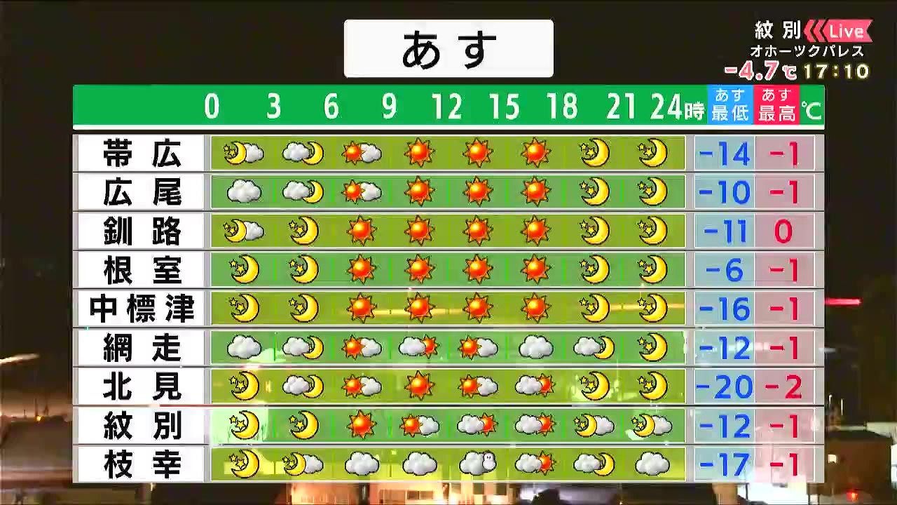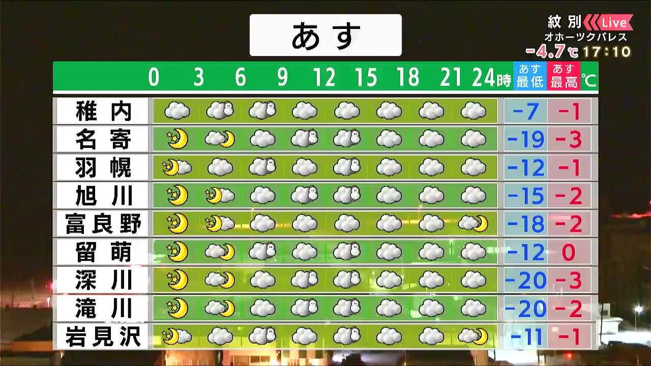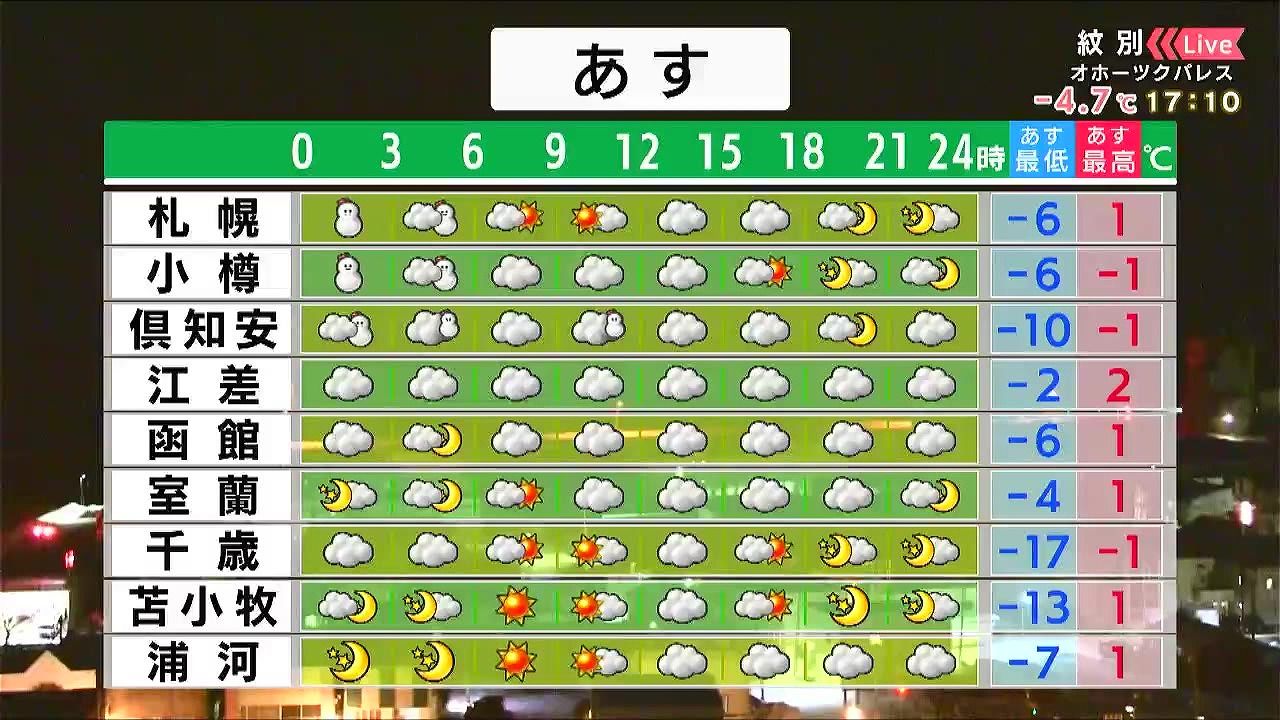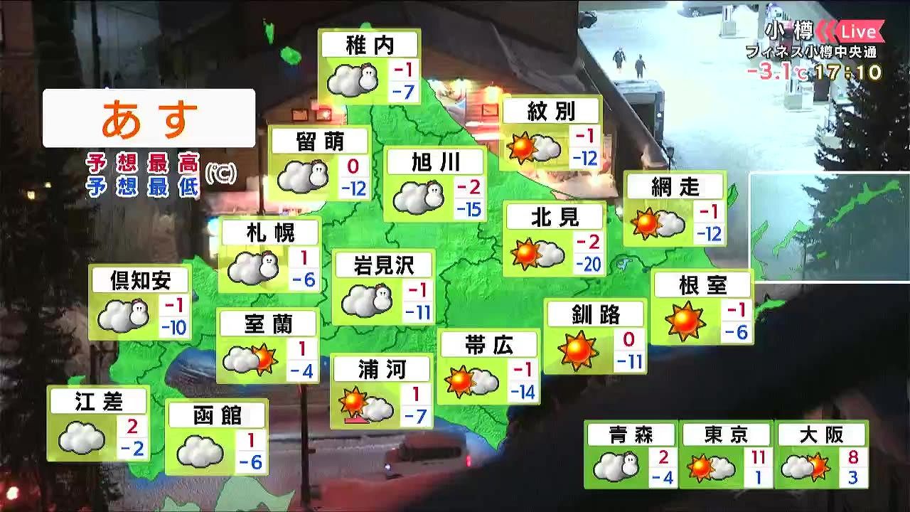 明け方まで札幌や小樽で雪が強まりますが、日中は穏やかで日が差すでしょう。函館や室蘭は曇り空、千歳は晴れますが、朝は‐17度まで冷え込みます。